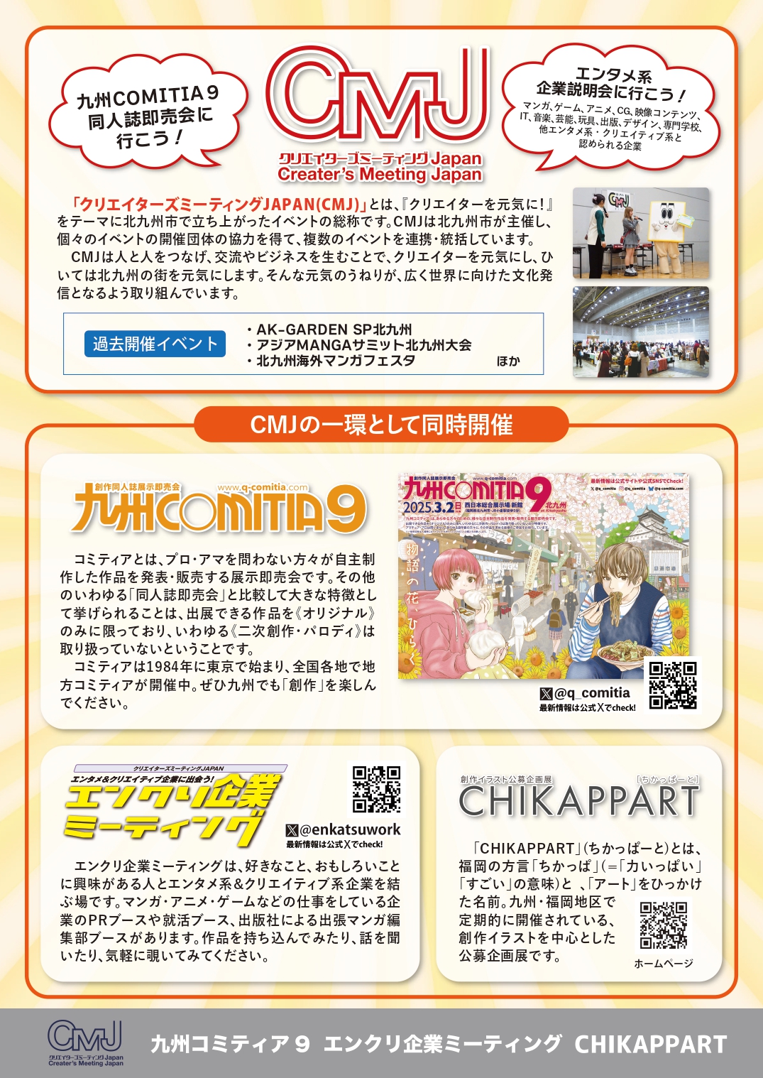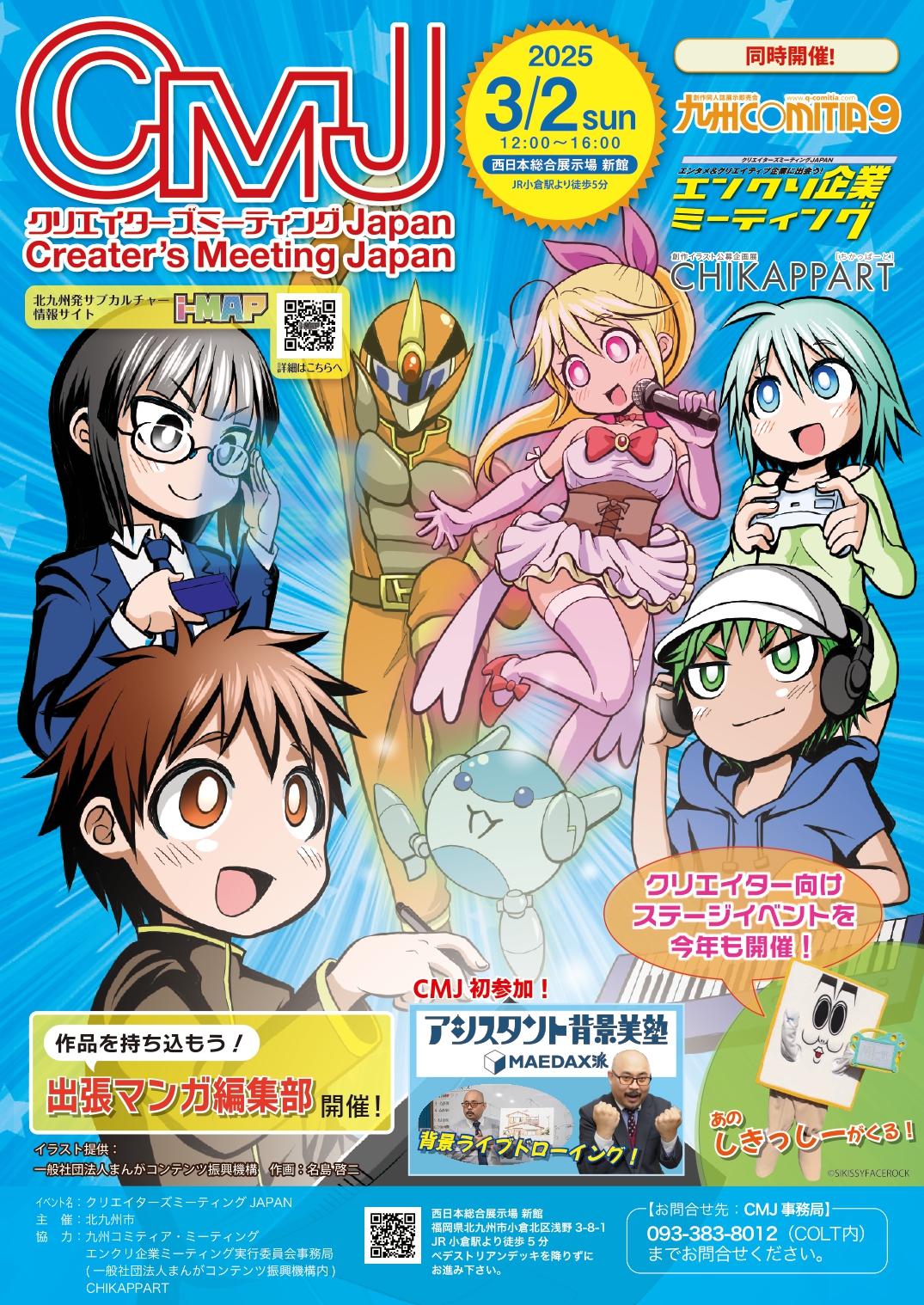 category -CMJ2024年11月30日 CMJ2025開催!チラシ公開(第一弾) CMJ今年も開催、チラシ第一弾はこちら! イラスト提供:一般社団法人まんがコンテンツ振興機構 イラストの作画は名島啓二 先生です! « 前のページ 次のページ » カレンダー 2025年12月 月 火 水 木 金 土 日 « 3月 1234567 891011121314 15161718192021 22232425262728 293031 最近の記事 アニメ制作会社「SO-DOクリエイティブ」が北九州市に誕生! CMJ2025チラシ第二弾 公開! ◤リアルブルバスター開発プロジェクト◢ ロボット開発 &ドキュメンタリー公開スタート 北九州市が舞台のモデル『メカウデ』 期間限定「音声ARアプリ「SARF」を活用したロケ地めぐり(2025年3月31日まで) CMJ2025開催!チラシ公開(第一弾) 全ての記事を一覧で見る カテゴリー CMJ eスポーツ その他のコンテンツ アニメ アニメ(sp) ブルバスター ポップカルチャー メカウデ リアルブルバスター開発プロジェクト 未分類 漫画 アーカイブ 2025年3月 2025年2月 2024年12月 2024年11月 2024年10月 2024年9月 2024年8月 2024年7月 2024年6月 2024年5月 2024年4月 2024年3月 2024年2月 2024年1月 2023年11月 2023年10月 2023年9月 2023年8月 2023年7月 2023年6月 2023年5月 2023年3月 2023年2月 2023年1月 2022年12月 2022年10月 2022年9月 2022年8月 2022年7月 2022年6月 2022年5月 2022年3月 2021年12月 2021年11月 2021年2月 2020年12月 2020年11月 2020年10月 2020年2月 2020年1月 2019年12月 2019年11月 2019年10月 2019年9月 2019年5月 2019年4月 関連する記事 CMJ開催いたします!!2021-11-272023年のCMJ開催情報です!!2023-02-21続CMJ設営中2021-12-18CMJ2025チラシ第二弾 公開!2025-02-11【CMJ】福岡県内イベント開催時のチェックリスト公開2021-12-16CMJ2021終了!!お疲れ様でした♪2021-12-20 RELATED LINKS関連リンク 北九州フィルム・コミッション 北九州市漫画ミュージアム 九州コミティア アジアMANGAサミット